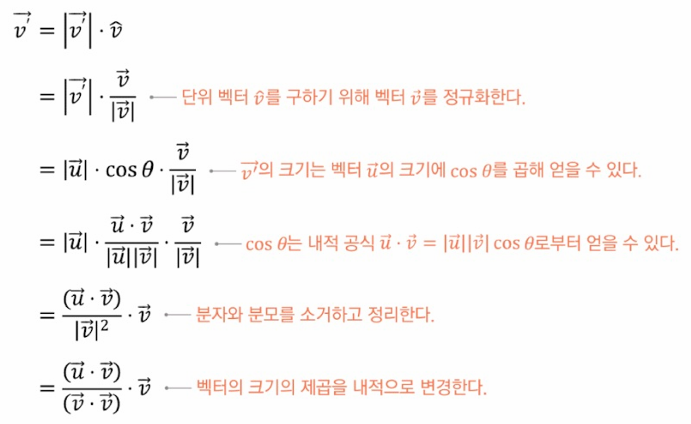 이 경우 내적을 활용한 투영 벡터를 구하는 공식이 활용됩니다.