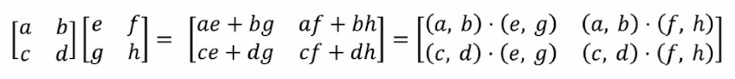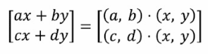 행렬과 벡터의 곱셈은 행렬을 구성하는 두 개의 행벡터 (a,b) , (c,d)와 벡터를 구성하는 열벡터 (x,y)의 내적을 표현할 수 있습니다.