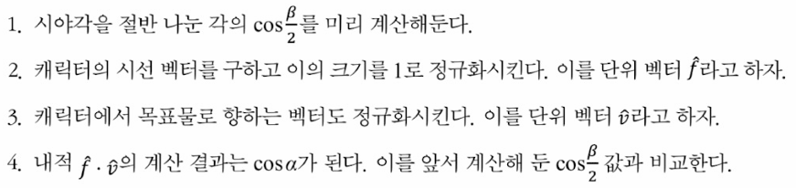 atan2 함수를 활용해 두 벡터가 이루는 각 a를 구한 후 이를 b/2와 비교해도 동일한 결과를 얻을 수 잇습니다. 하지만 단위 벡터를 구한 후 내적을 계산하는 방식이 atan2를 호출하는 것보다 더 효율적입니다.