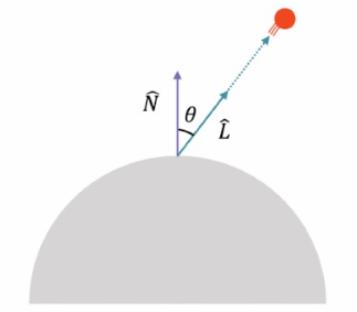 빛을 받아 표면에서 반사되는 빛의 세기는 두 벡터가 만드는 사잇각의 cos 함수에 비례한다는 것이 램버트 반사의 모델의 주요 내용입니다. 표면이 향하는 단위벡터를 n으로 지정하고 표면에서 광원으로 향하는 단위 벡터를 l로 지정해보면
