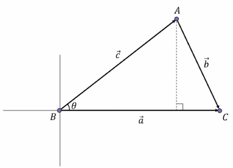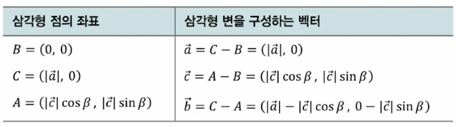 어떻게 유도되는지 확인을 해보면. 데카르트 좌표계에 세 점 A,B,C로 구성된 삼각형을 그리고 각 점을 마주보는 벡터를 a,b,c,로 원점에 위치한 사잇각은 세타로 지정해봅시다