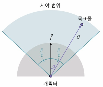 캐릭터에 부여한 시야각이 b라면 양쪽으로 균등하게 b/2의 시야각이 설정될 것입니다. 나머지는 앞뒤 판별 문제와 동일하게 캐릭터의 시선 방향을 벡터 f로 표시하고, 캐릭터에서 목표물로 향하는 벡터 v를 만든 후 벡터 f와 벡터v의 사잇각을 a로 설정합니다.